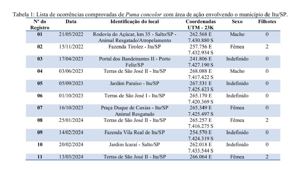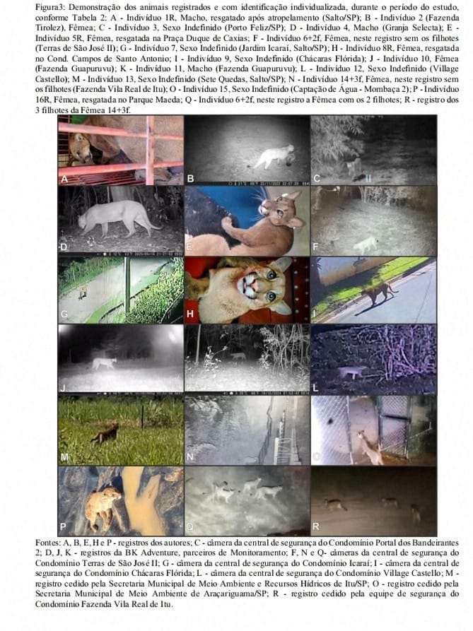 relatos e vídeos capturados por câmeras de segurança instaladas em residências, condomínios e empresas. A análise das pegadas considerou parâmetros biométricos para estimar o número de indivíduos e a possível presença de filhotes. As fezes coletadas foram analisadas para determinar a dieta. As carcaças de presas encontradas foram inspecionadas para identificar sinais de predação compatíveis com Puma concolor. As imagens capturadas pelas armadilhas fotográficas e câmeras de segurança foram utilizadas para confirmação da presença, possibilidade de individualização,