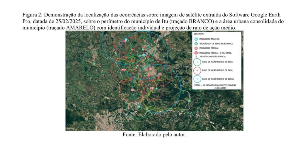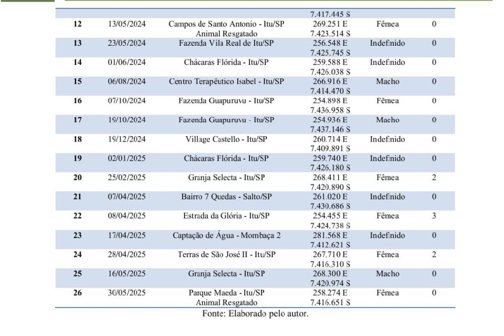 Ao todo, foram computadas 26 ocorrências confirmadas (Tabela 1). Embora o número total fosse de 65 registros, a contagem considerou apenas eventos distintos, eliminando duplicatas de um mesmo indivíduo no mesmo local, sendo considerada apenas a primeira ocorrência registrada. Adicionalmente, foram incorporados registros provenientes de municípios adjacentes quando a área de deslocamento do indivíduo pudesse influenciar o município de Itu, contemplando potenciais fluxos ecológicos relevantes para a região de estudo.