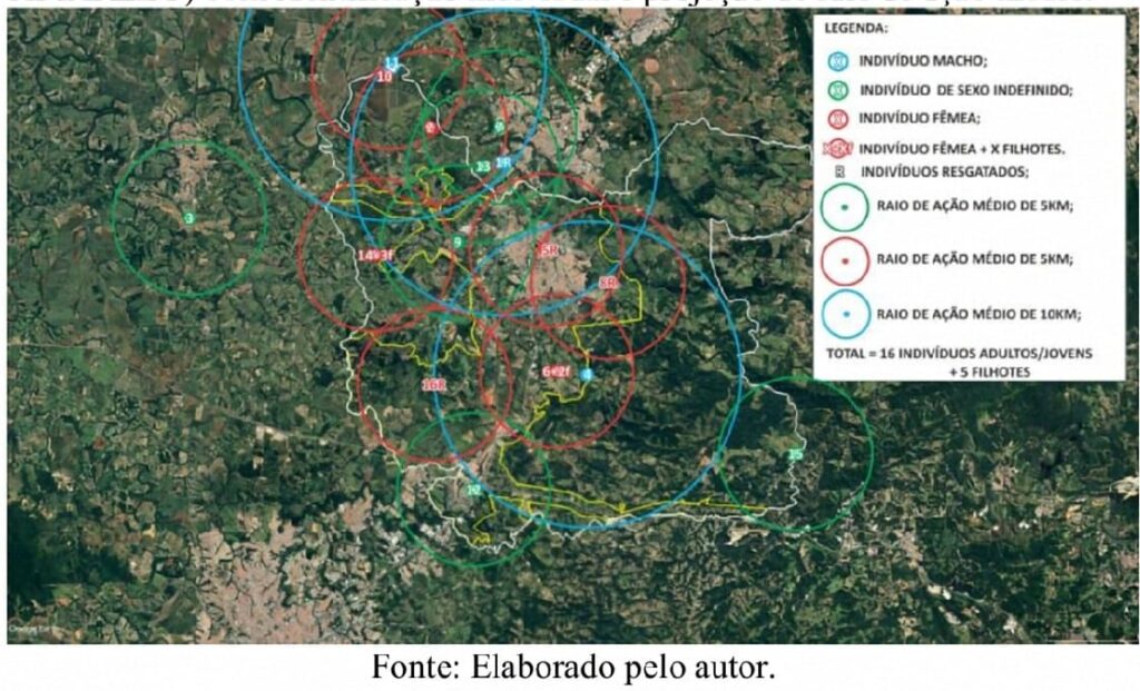 dos registros, considerando as datas de detecção, foi possível identificar deslocamentos atribuídos aos mesmos indivíduos. A análise espacial indicou a existência de áreas de uso bem definidas, com estimativa de raio médio de aproximadamente 5 km para fêmeas e indivíduos com sexo não determinado, e 10 km para machos (Figura 2). Os indivíduos com sexo indefinido foram mantidos nas projeções espaciais, porém, caso sejam machos, podem representar maior amplitude de movimentação. Não foram definidos raios de ação para os filhotes, sendo considerado apenas o raio de suas respectivas mães.
