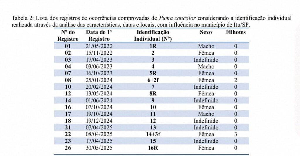 O presente estudo investigou a adaptação e mudanças no comportamento territorial e alimentar de Puma concolor em contextos urbanizados, utilizando o município de Itu/SP como estudo de caso. Foram analisadas ocorrências registradas entre maio de 2022 e maio de 2025, com base em evidências visuais provenientes de câmeras-trap, câmeras de segurança residenciais e relatos de moradores, complementadas por buscas in loco de pegadas, fezes e pêlos. A individualização dos animais permitiu identificar 16 indivíduos adultos/jovens e cinco filhotes, assim como mapear áreas de ação, com raios médios de 5 km para fêmeas e indivíduos de sexo indefinido e 10 km para machos.