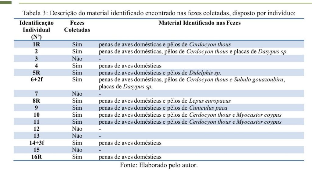 indivíduo (Tabela 2), resultando na identificação de 16 indivíduos adultos/jovens distintos e cinco filhotes distintos (Figura 3). Além da localização e identificação individual, em todos os pontos de ocorrência foram conduzidas buscas sistemáticas por indícios indiretos de presença, como pegadas, pêlos e fezes. As amostras fecais coletadas foram submetidas à análise qualitativa da dieta, permitindo a identificação das presas consumidas (Tabela 3).
