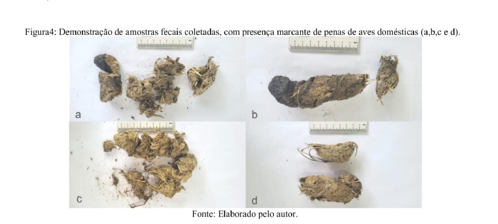 Nos quatro indivíduos resgatados (1R, 5R, 8R e 16R), as análises coprológicas revelaram a presença de pêlos de Cerdocyon thous, Didelphis sp. e Lepus europaeus, além de penas de aves domésticas, tais como galinhas, patos e gansos. Nas demais amostras fecais também foram registradas penas de aves domésticas (Figura 4). Esses resultados evidenciam o uso de recursos alimentares sinantrópicos e sugerem influência direta da oferta de presas associadas a ambientes antrópicos, corroborando observações de padrões semelhantes em estudos prévios (Martins et al., 2008).